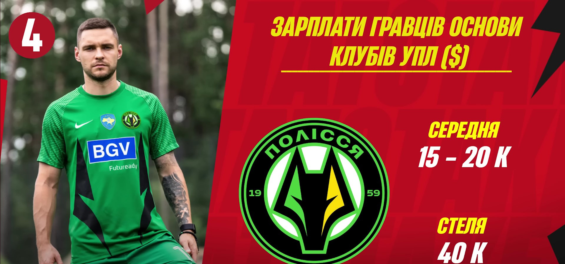 Житомирское "Полесье" предлагает своим футболистам в среднем 15-20 тысяч долларов в месяц и премии в 15 тыс. долларов на команду. За победу над "Шахтером" игроки получали 5-кратные премии. За попадание в еврокубки команда получила бонус в размере 2 млн долларов.