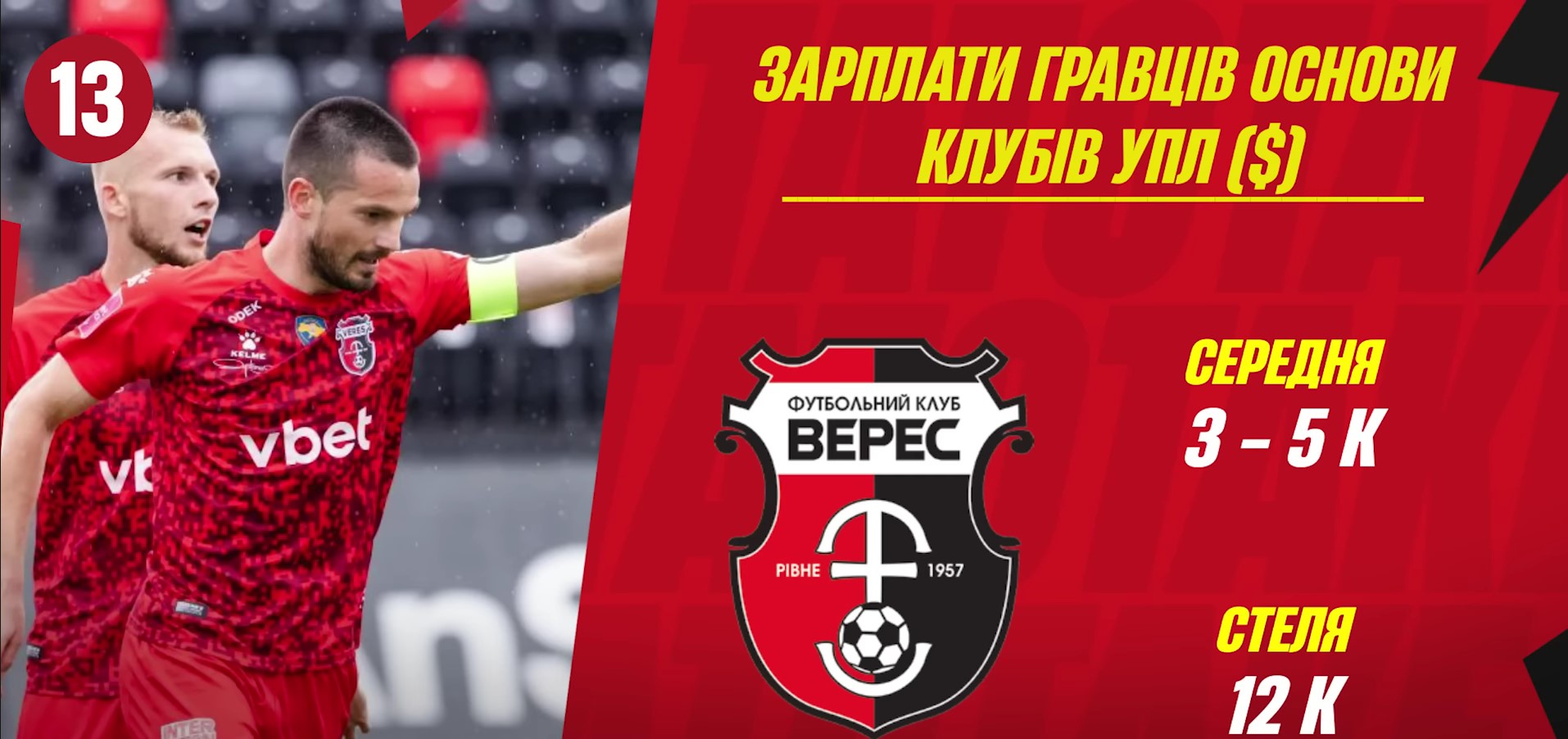 На 13-м месте расположился народный клуб "Верес", который предлагал своим футболистам неплохие условия, однако премии были уменьшены до 30 тыс. грн за победу.