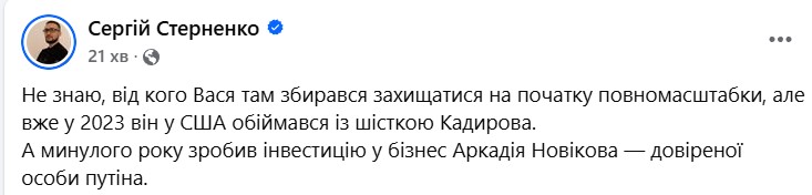 А в прошлом году сделал инвестицию в бизнес Аркадия Новикова — доверенного лица Путина", — написал Стерненко.