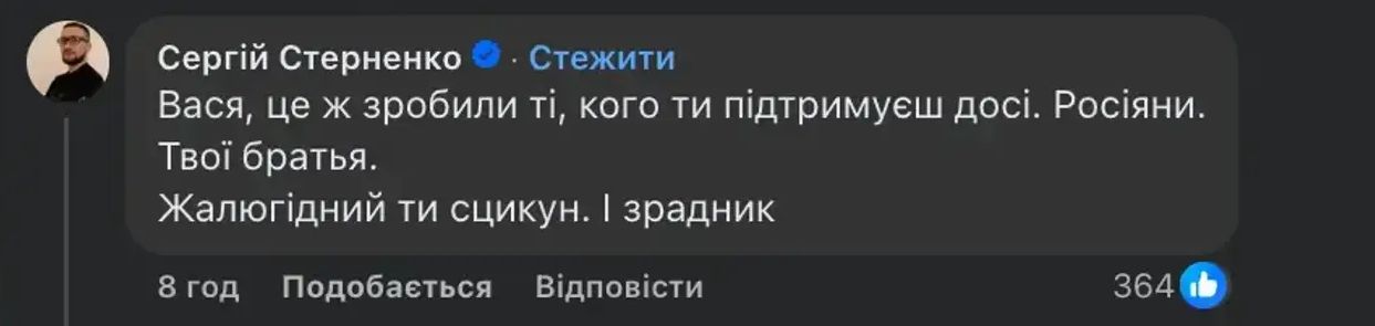 Стерненко: "Вася, это сделали те, кого ты поддерживаешь до сих пор. Россияне. Твои братья. Жалкий ты ссыкун. И предатель".