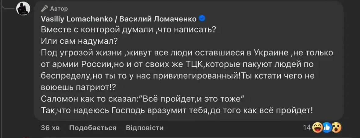 Ломаченко: "Вместе с конторой думали, что написать? Или сам надумал? Под угрозой жизни живут все люди, оставшиеся в Украине, не только от армии России, но и от своих же ТЦК, которые пакуют людей по произволу, но ты у нас привилегирован! Ты, кстати, чего не воюешь, патриот? Соломон однажды сказал: "Все пройдет, и это тоже". Поэтому, надеюсь, Господь вразумит тебя, прежде чем все пройдет".