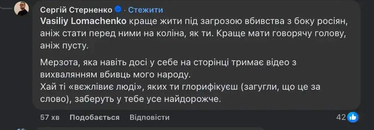 Стерненко: "Лучше жить под угрозой убийства со стороны россиян, чем встать перед ними на колени, как ты. Лучше иметь говорящую голову, чем пустую. Мерзость, которая до сих пор у себя на странице держит видео с восхвалением убийц моего народа. Пусть те "вежливые люди", которых ты глорифицируешь (загугли, что это за слово), заберут у тебя все самое дорогое".