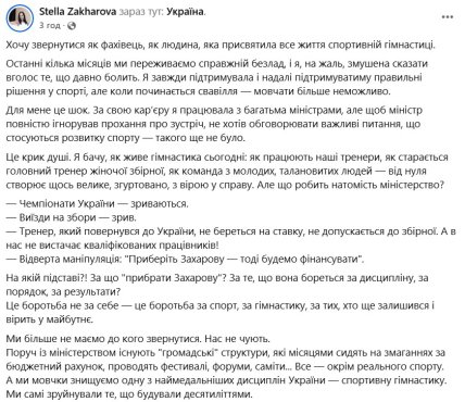 Вице-президент Украинской федерации гимнастики (УФГ), олимпийская чемпионка Стелла Захарова прошлась по работе Министерства молодежи и спорта Украины, а также его главе Матвею Бидному. Накануне Захарова поддержала украинского боксера Василия Ломаченко.