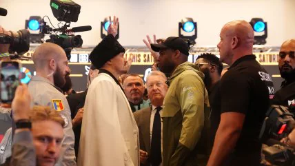 Накануне боксеры провели открытые тренировки, Усик появился на публике в футболке с важным посланием, после чего Кот и Динамит встретились лицом к лицу на совместной пресс-конференции. Кроме того, чемпионы провели официальную процедуру взвешивания, на которой британец значительно перевесил украинца.