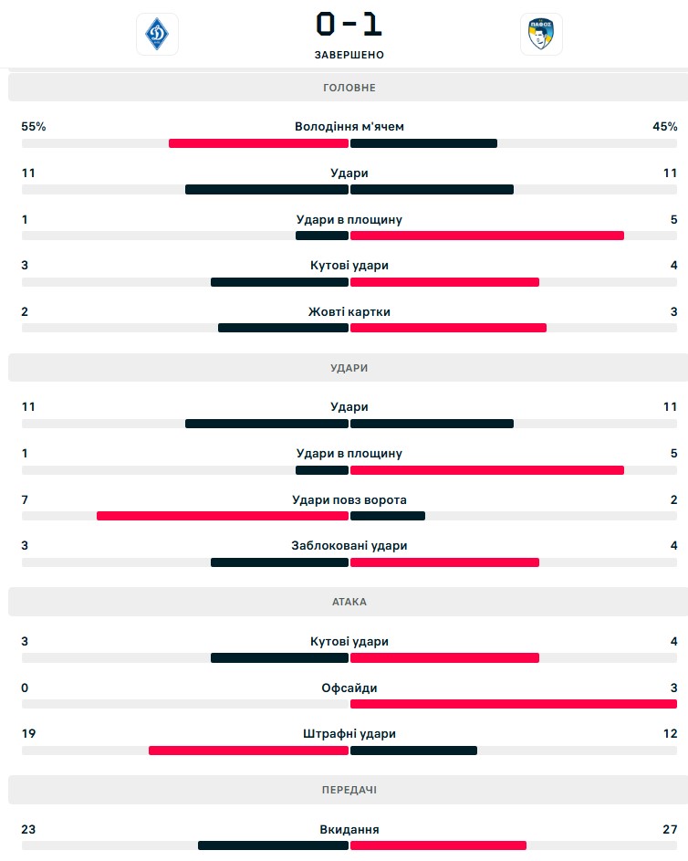 Кипрская команда предложила киевлянам быстрый футбол с обилием атак. "Пафос" вчистую выиграл дебют, однако Бело-синие ближе к середине тайма выровняли игру и также стали создавать опасные моменты у ворот соперника. Ключевой момент игры произошел в середине второго тайма. Швейцарский арбитр Сандро Шерер назначил пенальти в ворота гостей за спорный фол на Владиславе Ванате, однако через минуту рефери после просмотра VAR отменил 11-метровый.