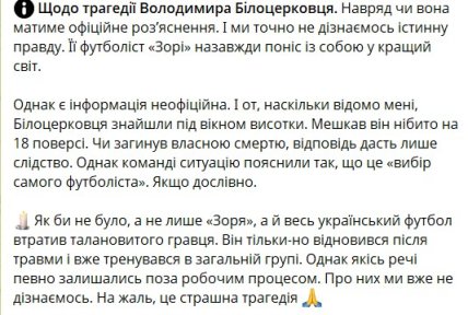 Однако есть информация неофициальная. И вот, насколько мне известно, Белоцерковца нашли под окном высотки. Жил он якобы на 18 этаже. Погиб ли собственной смертью, ответ даст только следствие. Однако команде ситуацию объяснили так, что это выбор самого футболиста. Если дословно.