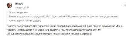 Органам опеки стоит проверить эту психбольную. Ребенку около недели, она тащит его на лед, где низкие температуры, а также просто опасно в силу того, что лед скользкий и твердый. Помимо этого, у пары в доме 12 собак, что является опасным в плане различных болезней и антисанитарии. Вообще, конечно, п***ец. У фигуристов походу мозгов вообще ноль целых ноль десятых. Этот даже родиться не успел, а его уже не лед вытащили и постят каждый день. Очень жалко детей подобных идиотов.