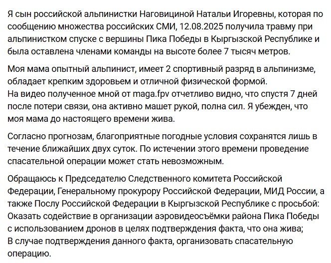 Накануне Михаил Наговицин обратился к властям РФ с призывом спасти мать в ближайшие несколько дней. Дело в том, что благоприятная погода на горе способствует эвакуации. Сын альпинистки считает, что его мать жива из-за видео 7-дневной давности, которое снял БПЛА. На кадрах Наталья находится в палатке и активно машет рукой.