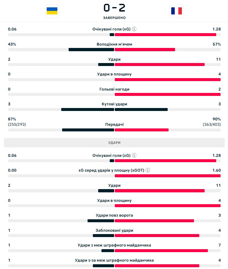 Французы с первых минут захватили инициативу и не давали украинцам никаких шансов в нападении. Тотальное преимущество во владении на чужой половине поля позволило Трехцветным проводить атаку за атакой. Одна из таких завершилась голом. Барколя вывел Майкла Олисе на ударную позицию, и нападающий без опеки пробил точно в угол ворот. У Сине-желтых ничего не клеилось спереди, единственный удар с xG 0,02 (забить крайне маловероятно, — Ред.) в первом тайме у украинцев нанес Артем Довбик.