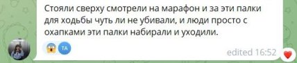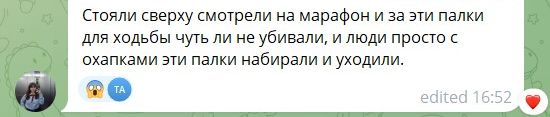 По информации telegram-канала Baza, на старте пешего 3-километрового марафона образовалась давка. Причиной инцидента стали палки для ходьбы, которые раздавались организаторами бесплатно.