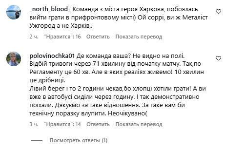 Игра должна была начаться в Чернигове в 12:30 по киевскому времени, однако началу поединка помешала воздушная тревога. "Металлист" подождал час, после чего покинул арену. Хозяева обвиняют харьковчан в "отсутствии уважения", передает пресс-служба "Чернигова" в Instagram.