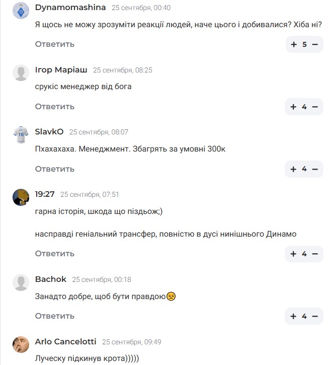 В сети со смехом восприняли данную новость. Один из пользователей пошутил, что Луческу подсунул "Динамо" крота, другой отметил, что менеджмент "Динамо" опозорился с этим переходом.