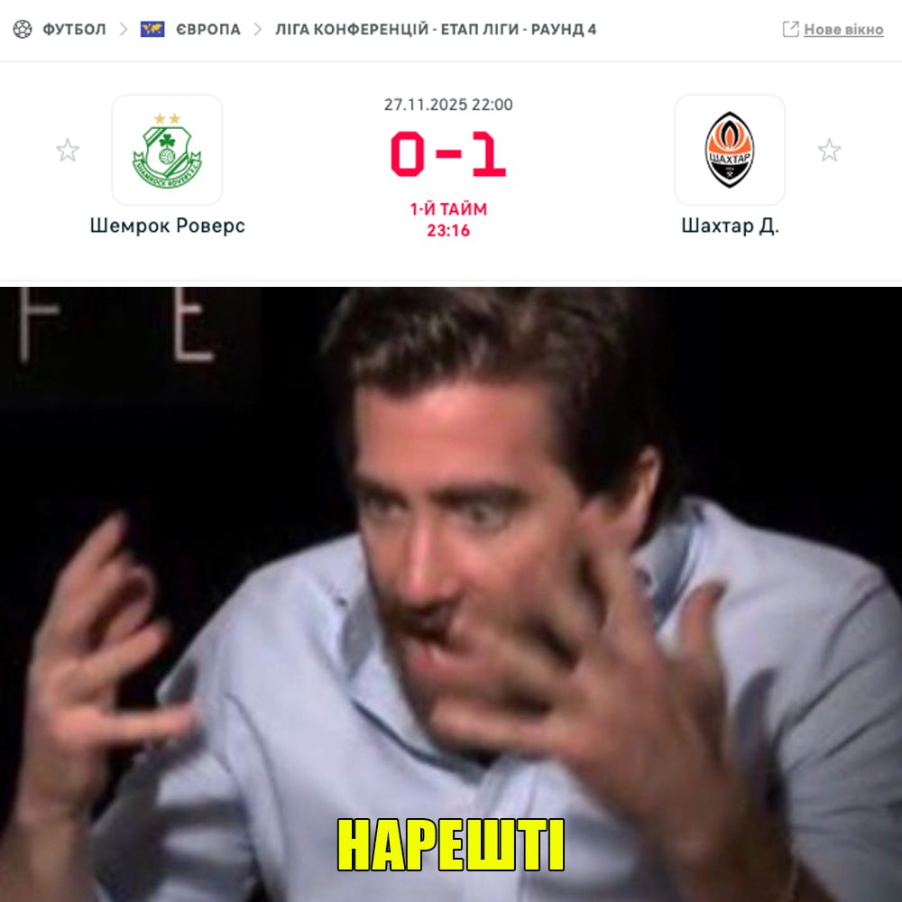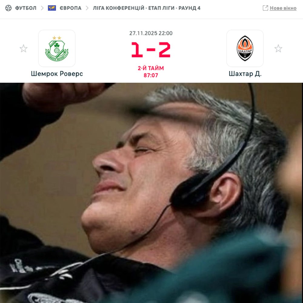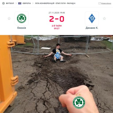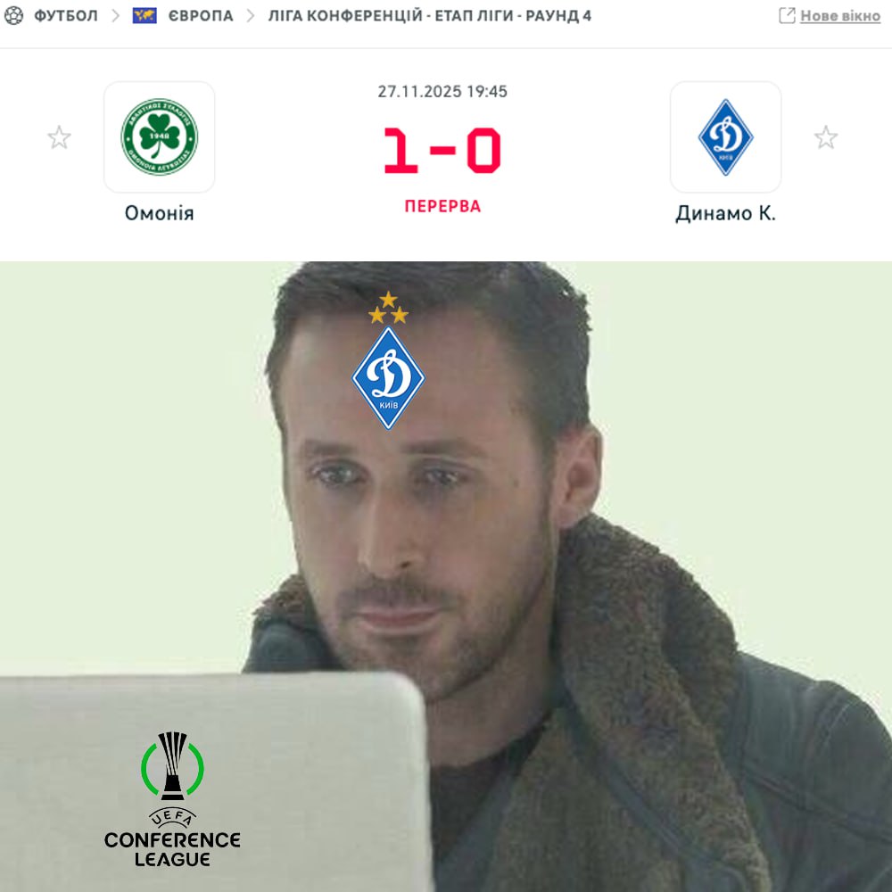 В четверг, 27 ноября, киевское "Динамо" безвольно проиграло "Омонии" (0:2), а донецкий "Шахтер" с трудом обыграл "Шемрок Роверс" (2:1) в 4-м туре основного этапа Лиги конференций УЕФА сезона 2025/26. Украинцы отреагировали на события вокруг матчей мемами и шутками.
