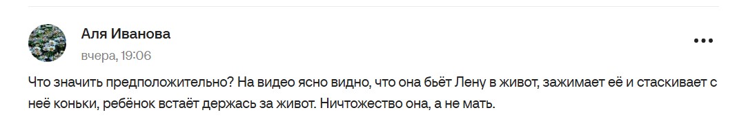 Лена выбежала со льда без чехлов, села на скамейку… Через 2 минуты пришла я. Нугуманова (тренер) уговаривала ее вернуться на лед. Та истерила. Я сказала: снимай коньки. Нечего орать. Лена продолжала орать. Я начала снимать с нее коньки без чехлов. Она пнула меня. Я ее.