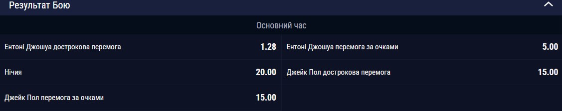Однако изменились котировки на метод победы. К примеру, шансы Джошуа на нокаут чуть уменьшились, а на победу по очкам увеличились. Также уменьшились шансы Пола на нокаут, однако вероятность его успеха судейским решением увеличилась.