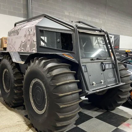 Добавим, Sherp оснащается четырехцилиндровым 1,5-литровым дизельным двигателем мощностью 44,3 лошадиные силы, работающим с 5-ступенчатой механической коробкой передач. Привод передается на все колеса. Компактный 3,4-метровый Sherp имеет большие колеса низкого давления, а его клиренс составляет 600 мм. Украинский вездеход способен развивать 45 км/ч по суше и 6 км/ч – по воде.