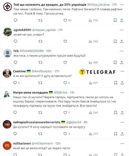 Как видно на видео, устройство механическое. Он крепится с помощью пояса на туловище человека, а дальше пловец просто крутит колеса, как на обычном велосипеде. Конечно, это не более чем шутка, поскольку все знают, насколько стремительно течение в Тисе, и что этот гаджет никак не поможет. Но украинцы традиционно стали подшучивать под подобными постами. Публикуем самые смешные, на наш взгляд, комментарии: