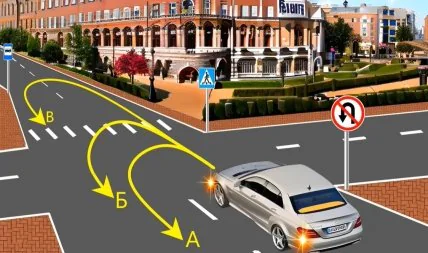 Траектория А – это обычный разворот, который разрешен ПДД. Однако знак нам это запрещает в этом случае. Траектория Б проходит через пешеходный переход, а В — через автобусную остановку. В Правилах дорожного движения значится только запрет разворота на пешеходных переходах, а вот в местах для остановки транспортных средств такой манёвр не запрещен. Поэтому в этом случае разворот разрешен только по траектории В.
