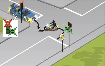 Однако мотоциклист не может знать достоверно, какой сигнал светофора включен со стороны приближающегося автомобиля. Поэтому, для обеспечения безопасности, ему следует убедиться, что водитель автомобиля уступает действительно дорогу, и только после этого завершить маневр разворота.