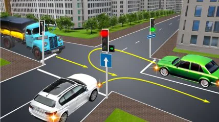 С противоположной стороны перекресток пытается проехать прямо водитель грузовика. Для него (что логично) тоже зеленый свет. Перпендикулярно им на перекрестке стоит белый автомобиль, у которого горит правый указатель поворота. Для него на светофоре – красный цвет с зеленой стрелкой вправо. Но движение ему разрешено только прямо. Так кто же проедет первым?