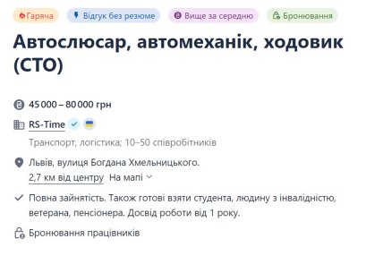 Так, компания, специализирующаяся на транспортных услугах, ищет опытного автослесаря для работы на станции технического обслуживания во Львове. Вакансия предусматривает полную занятость и заработную плату от 45000 до 80000 гривен в месяц.