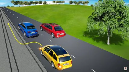 Представьте себе дорогу с тремя автомобилями: красным, синим и желтым. Красный и синий автомобили двигаются прямо в попутном направлении. Водитель желтого автомобиля намерен их опередить, включив левый указатель поворота. Его план — выполнить маневр опережения по трамвайному пути попутного направления, расположенному на одном уровне с проезжей частью.