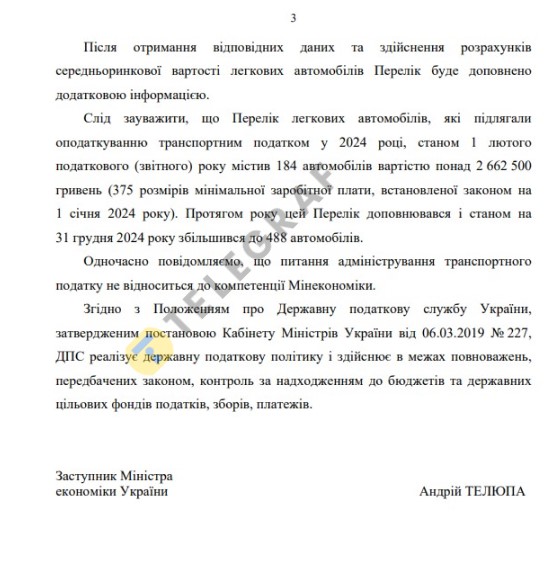 "В феврале текущего года по обращению ГНС Минэкономики направило запрос ГП "Держзовнішінформ" с просьбой предоставить дополнительную информацию о цене нового транспортного средства на 200 легковых автомобилей, в том числе McLaren, Ferrari, Alpina, которые не включены в Перечень, но имеют признаки объекта налогообложения.
