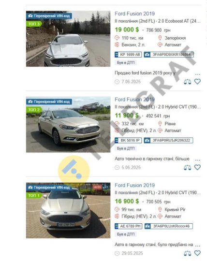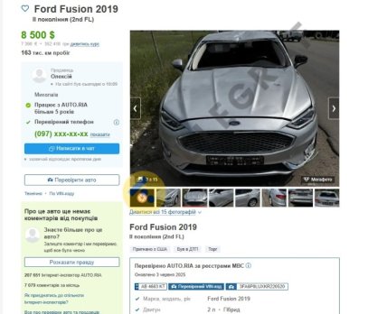 Вот, к примеру, владелец продает собственное авто Ford Fusion 2019 за 8500 долларов. Пробег авто относительно небольшой — за 180 тысяч километров. Однако есть нюанс – машина сильно повреждена практически со всех сторон. "Автомобиль был припаркован возле здания, в которое попал шахед. Взрывной волной был поврежден кузов. Авто на ходу, никаких проблем по ходовой и двигателю коробке нет", — утверждает владелец.