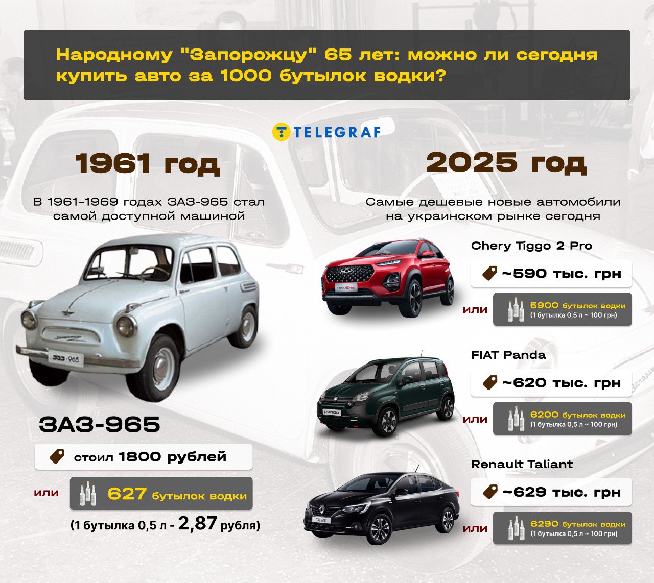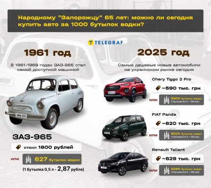 Один из самых дешевых новых автомобилей на украинском рынке сегодня – китайский Chery Tiggo 2 Pro. На сайте официального дилера Chery Automobile Co. Ltd цена начинается с 590 тысяч гривен. Если поделить на стоимость бутылки водки, выходит 5900 бутылок. Почти в шесть раз больше, чем стоил "Запорожец" в то время.