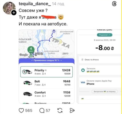 При этом официальная статистика сервисов несколько иная: в октябре 2025 г. сервис Uklon якобы поднял тарифы в Киеве всего на 14%. Bolt увеличил цены на 3–5%. Во Львове такси подорожало больше всего — на 15-20%. В то же время, если раньше средний чек поездки по городу составлял около 200 гривен, то сейчас — 270-290 гривен. Машины класса Комфорт обойдутся от 320 гривен.