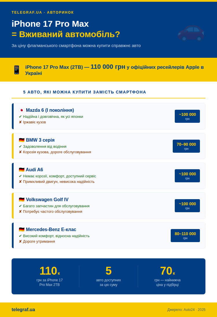 "Телеграф" рассказывает о том, какую машину можно приобрести вместо современного смартфона. Отметим, что прямо сейчас цена на iPhone 17 Pro Max (2TB) у большинства официальных ресейлеров Apple в Украине составляет 110 тысяч гривен.
