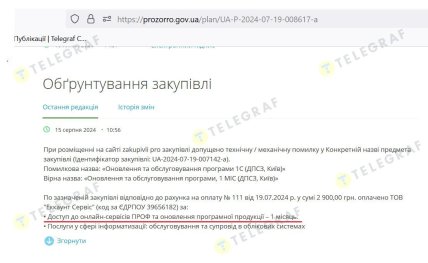 А тепер цікавий момент: на сторінці закупівлі на сайті Prozorro вказано, що Державне підприємство спеціального зв'язку оплатило компанії "Еккаунт Сервіс" "Доступ до онлайн-сервісів ПРОФ та оновлення програмної продукції – 1 місяць."
