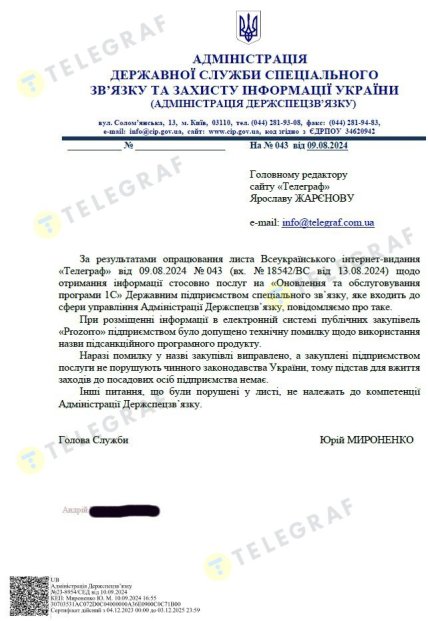 Серед таких установ виявилося і Державне підприємство спеціального зв’язку (ДПСЗ), яке входить в структуру Державної служби спеціального зв’язку та захисту інформації, що якраз і покликана боротися з ризиками від використання російського ПЗ. Відповідний тендер на порталі Prozorro виявили розслідувачі "Телеграфу". Тому для прояснення ситуації редакція надіслала запит власне до Держспецзв’язку.