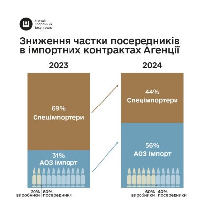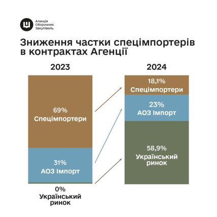 У 2023 році на спецімпортерів припадало 69% від суми контрактів Агенції оборонних закупівель. Натомість зараз, завдяки активному контрактуванню українських виробників та збільшенню прямого імпорту, їхня частка становить лише 18%.