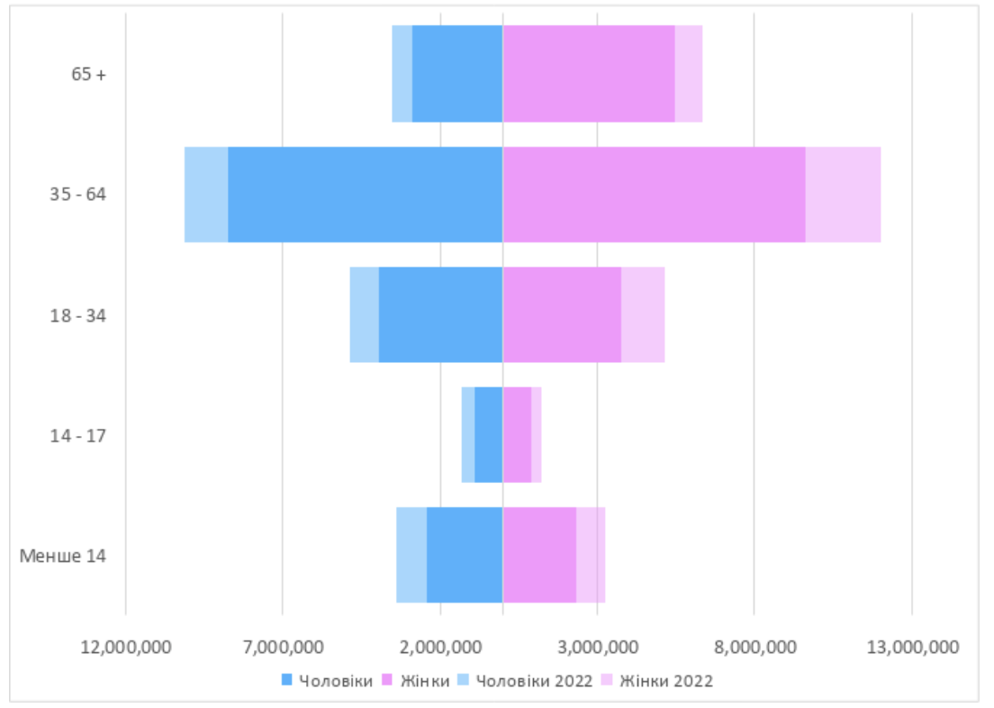 Депопуляція в Україні продовжується з 90-х років. Вже давно не 52 млн мешкають в Україні. І навіть не 41 млн — як свідчать дані, які часто використовують наші міжнародні партнери. За оцінками Advanter Group на контрольованій території України зараз мешкають 31 млн українців. Вікова структура населення також погіршується.