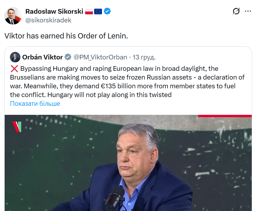 Мадам Захарова (речниця "мид ры-фы"), коментуючи допис пана Радослава Сикорського (міністр зовнішніх справ Польщі), стосовно витівок Орбана (ну той самий, про "орден Леніна"), вирішила зіграти трошки "в юмор" …