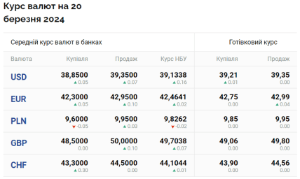 За даними порталу "Мінфін", у середу, 20 березня, середній курс долара в українських банках становить 38,85 грн (купівля) та 39,35 (продаж). Готівковий курс — 39,21 (купівля) та 39,35 (продаж). Водночас офіційний курс Національного банку України — 39,13 гривні.