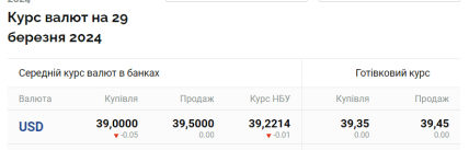 За даними порталу "Мінфін", у п'ятницю, 29 березня, середній курс долара в українських банках становить 39,0 грн (купівля) та 39,50 (продаж). Готівковий курс — 39,35 (купівля) та 39,45 (продаж). Водночас офіційний курс Національного банку України — 39,22 гривні.