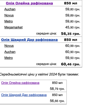 Ціна соняшникової олії "Олейна" з квітня по травень знизилась з 58,79 грн до 56,35 грн за 850 мл. А от вартість за пляшку олії "Щедрий дар" стала більша — ціна зросла з 56,66 грн до 60,46 грн за 850 мл.