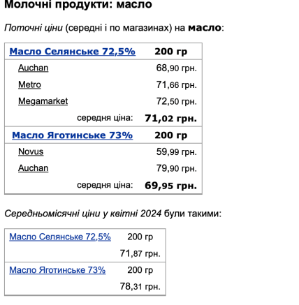Найвигідніша пропозиція масла у магазинах мереж Novus — там за пачку "Яготинського" покупець мусить заплатити майже 60 грн. У той час, як у магазинах "Ашан" цінник на це ж масло досягає майже 80 грн.