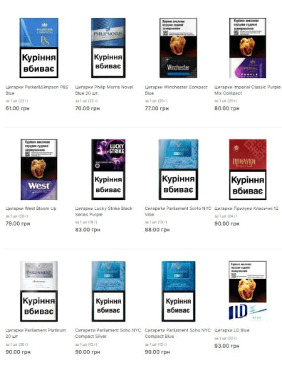 У "Varus" найнижча ціна на цигарки складає 61 гривню — Parker&Simpson. Є також більш дорожчі — від 70 до 93 гривень. Серед марок — Philip Morris, Winchester, Imperial Classic, West, Lucky Strike, Parliament, Прилуки та Rothmans.