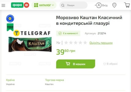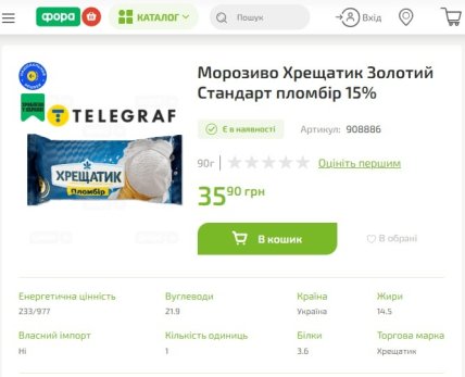 - "Хрещатик" пломбір 15% 90 грамів — 35,90 гривень;