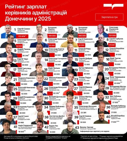 Зарплати посадовців Донецької ОВА становлять від 110 до 140 000 грн на місяць. В той час як зарплата мера найбільшого міста регіону Маріуполя складає лише 31 000.