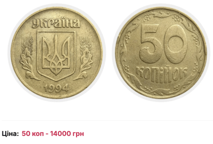 В Україні є чимало коштовних унікальних монет, які можна продати за чималі гроші. До прикладу, за монету 50 копійок 1994 року можна отримати до 14 тисяч грн.