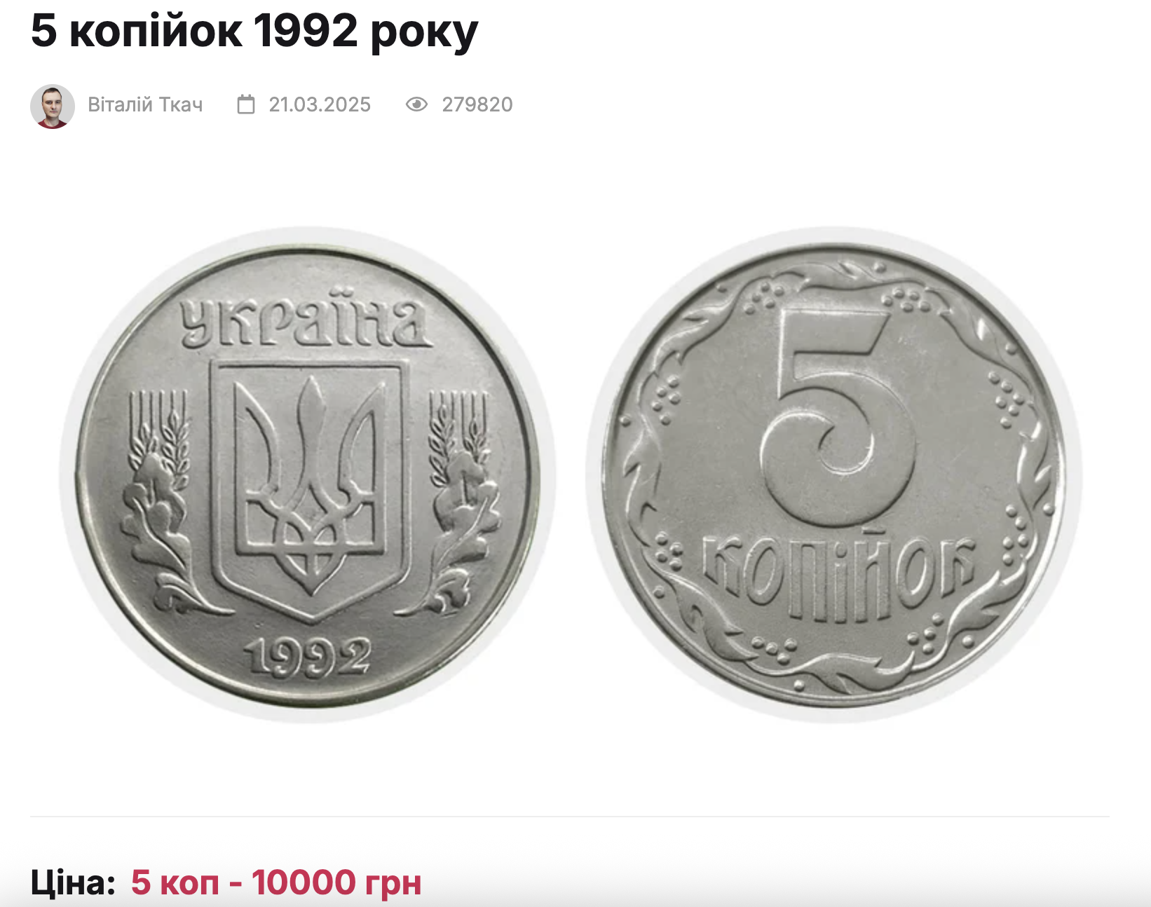 В Україні є чимала кількість унікальних монет, які можна продати за величеньку суму. Так, до прикладу, за стару монету 5 копійок можуть заплатити до 10 тисяч грн.