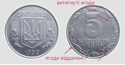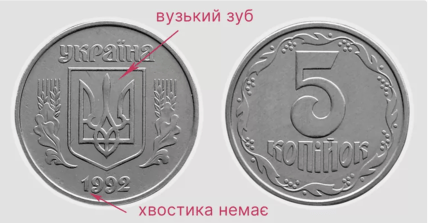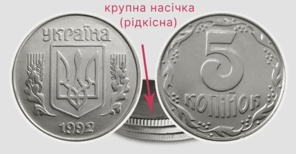 Йдеться про 1.1ААк з крупною насічкою. Монета 5 копійок 1992 року через помилку на монетному дворі отримала крупну насічку на гурті (ребрі). І саме такий екземпляр вважається найціннішим, його можна продати за 10 тисяч грн. Однак таких монет доволі небагато в обігу.