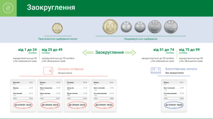 - суми, що закінчуються на 1-24 коп. — округлюються вниз до повної гривні (наприклад, 23,24 грн → 23,00 грн);