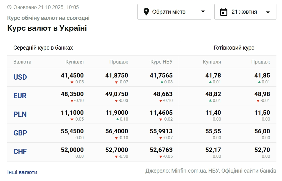 За даними сайту "Мінфін", станом на 21 жовтня середній курс валюти США по Україні становить 41,45 грн (купівля) та 41,87 грн (продаж). Євро тим часом котується трохи дорожче — 48,35 грн (купівля) та 49,07 грн (продаж). Курс Нацбанку тим часом становить 41,75 грн за долар і 48,66 грн за євро.