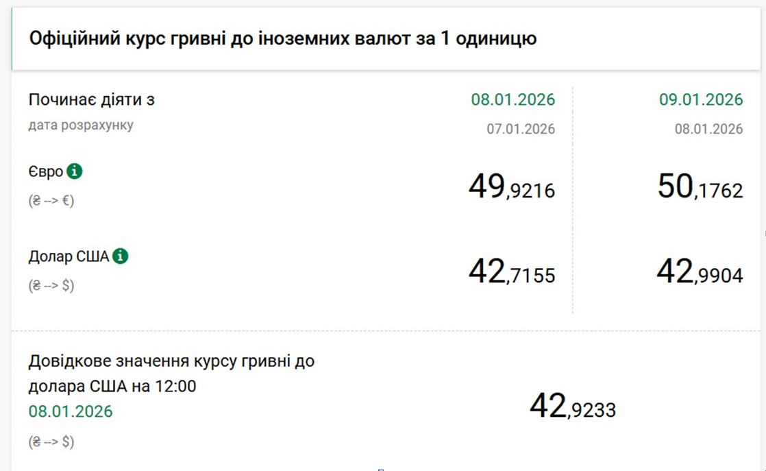 Українська валюта активно дешевшає з початку року. 1 січня гривня розпочала 2026 рік офіційним курсом до долара на рівні 42,35 грн/$, до євро — 49,79 грн/€. Але за підсумком сьогоднішніх торгів на міжбанку Нацбанк встановив на завтра, 9 січня, їх на 42,9904 грн/$ і 50,1762 грн/€ відповідно.