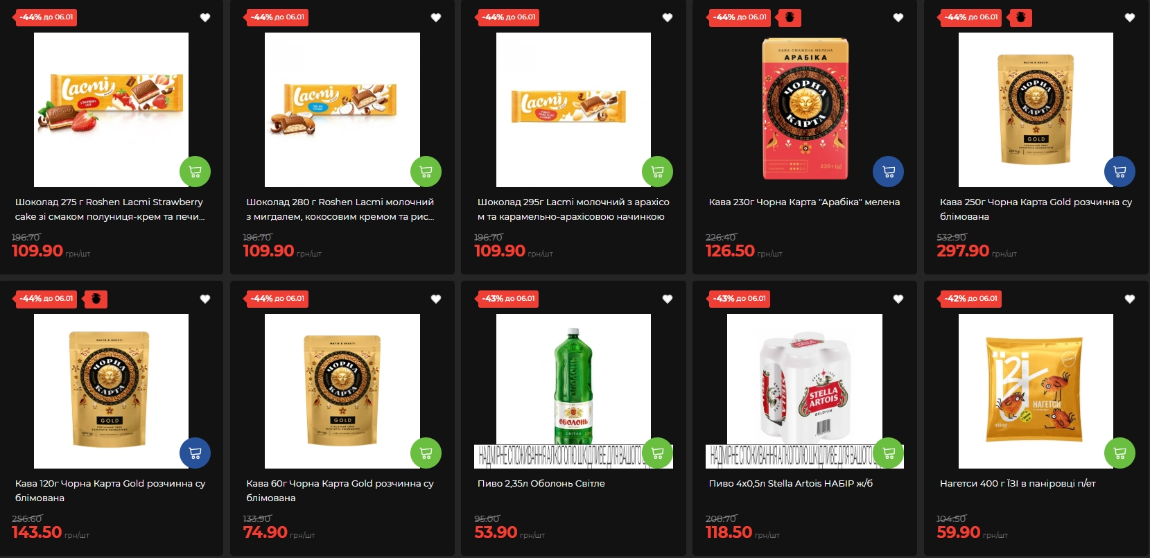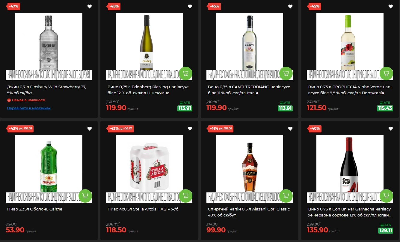 Stella Artois у форматі набору чотири банки подешевшав на 43% — до 118,50 гривень. Слабоалкогольний напій Оболонь Джин-Грейпфрут коштує 29,50 гривень зі знижкою 35%, пиво Чернігівське Біле — 40,50 гривень.